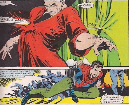 As the Great Turhan begins “sending negative energy” to a young girl, Peter Parker’s Spider Sense goes haywire and Turhan is shot! Peter changes into Spider-Man and chases down the killer.