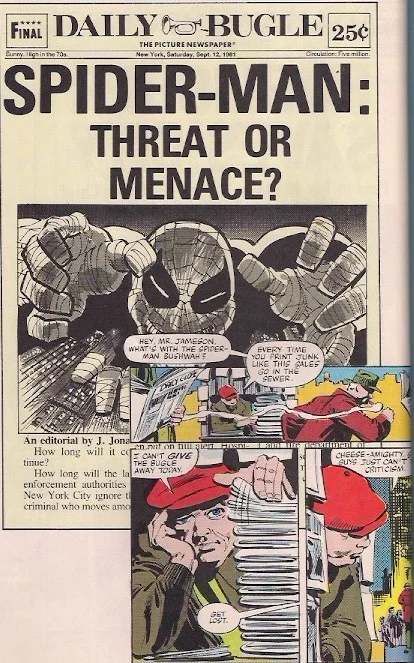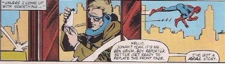 Spider-Man, in no shape to fight, leaves the scene and sees the girl being hauled off to the hospital. Meanwhile, Ben Urich calls into the Bugle with his story and a new front page is put together: