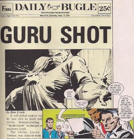 We cut to the Punisher, on a rooftop, planning on ridding the world of a bad influence. Inside the building, Peter is taking pictures of a guru who claims to have the Dim Mak, the death touch, where he puts an assistant into a coma and if he doesn’t return the subject to life they will die in three days.