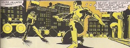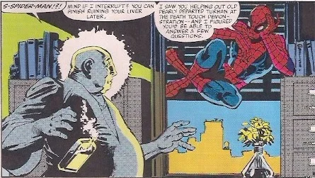 Spider-Man begins investigating Turhan’s brother. He hangs him from a ceiling fan and questions him. Spidey learns that they were supposed to deliver the poison but went into business for themselves with the death touch and that the supply was supposed to go to Pier 43 that night. Spidey heads to the morgue for the ring only to discover that the body was stolen! Ben Urich once again calls the Bugle offices and the front page is re-plated to: