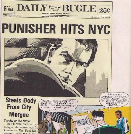 Punisher escapes from his webbed prison just as cops arrive, but he won’t fight the law, so he allows himself to be arrested. Jameson changes the front page one last time: