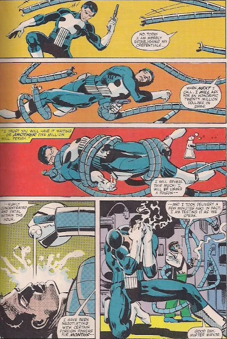 Punisher breaks in but is captured by Doc Ock and used as a test subject!