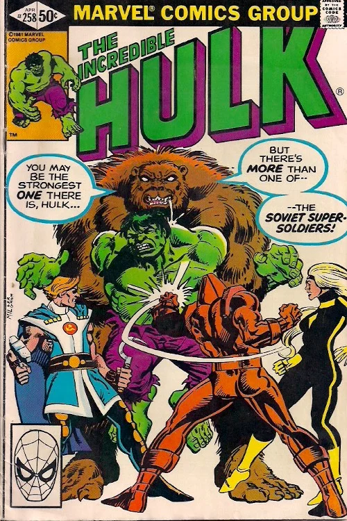 Trapped behind the Iron Curtain, the Hulk takes on a Bear! It’s the debut of the Soviet Super Soldiers in The Incredible Hulk #258 by Bill Mantlo and Sal Buscema! See you next week!