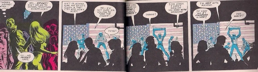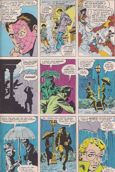 Peter uses the fire alarm as a chance to disappear but runs right into Deb Whitman, whom he as a date with later in the night. Peter’s forced to cancel in true Parker fashion, with no explanation.