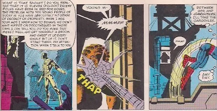 As Spider-Man arrives in the Village he’s chased by two stone gargoyles come to life. He quickly webs one and slingshots it into the other destroying them both. He’s then met by a concerned bystander: