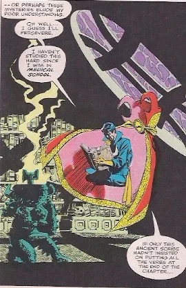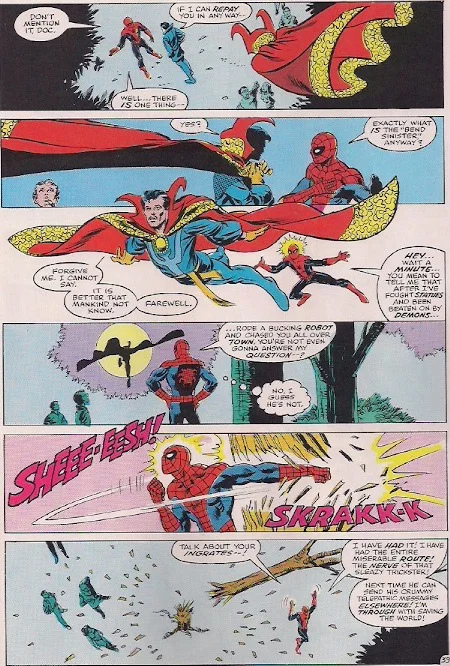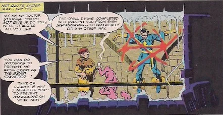 Absolutely, I loved this story. O’Neil and Miller crafted my favorite type of Spidey story, where he’s in above his head and out of his element. Nothing goes right for Peter. He loses the girl twice, probably failed the lab he was in, beats up a bunch of gargoyles and for his trouble gets yelled at by an old lady, and shut out by Dr. Strange. It’s classic Parker-luck. The situation is life and death and yet there’s still humor with both Spidey and Dilby, something that I think is missing from today’s comics.