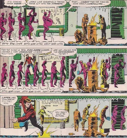 Spider-Man follows the group as it marches through the Arch at Washington Square Park, and eventually uptown to Times Square. Finally the group reaches their destination, the Latverian Embassy, where Dilby has Dr. Strange tied to a giant gem, using him to conjure the Bend Sinister.