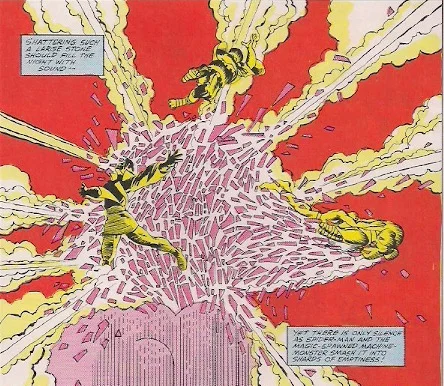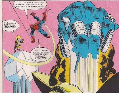 Dilby sics the robot on Spidey and they battle, finally Peter manages to use his webbing to direct them right into the gem, destroying it.