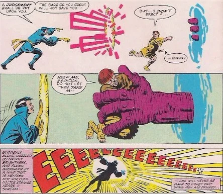 Strange now free, begins conjuring a spell to render Dilby powerless but Dilby is grabbed by a hand and dragged into another dimension.