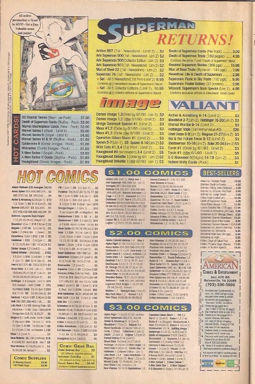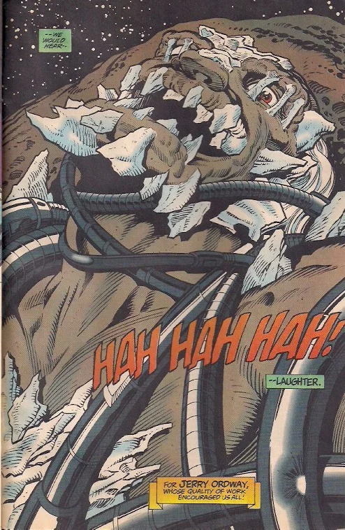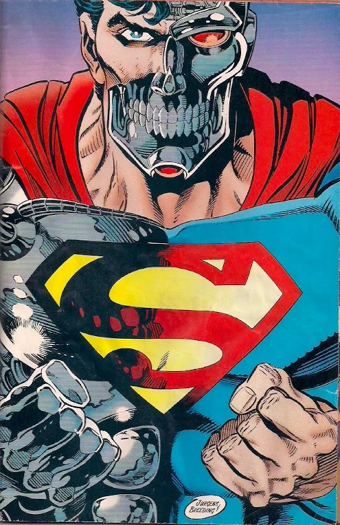 Ah, the Cyborg Superman, the replacement Superman that turned out to be a villain. This Superman claimed to be the reconstructed Superman, rebuilt and better than ever. In this issue, he ties the body of Doomsday to a meteor and hurls him into space. Later in the storyline, Cyborg Superman reveals himself to be Hank Henshaw, an astronaut who believes that Superman was responsible for the irradiation of his ship and his crew. Now he rebuilt himself in Superman’s image in a plot to ruin his name!