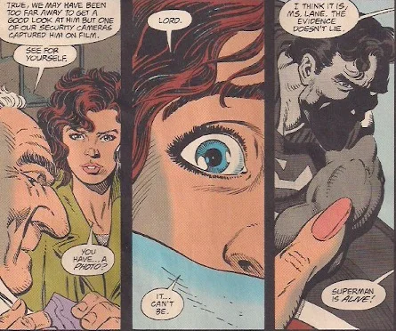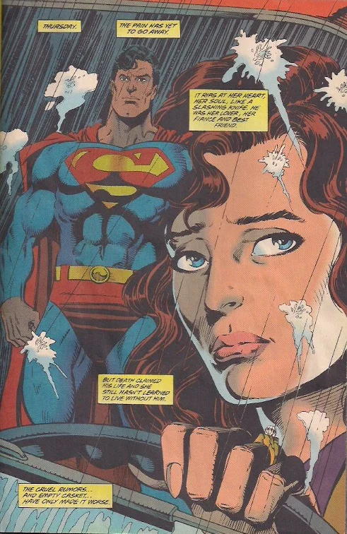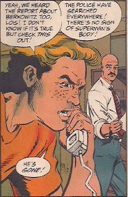 Stuck in traffic on her way back from Lexcorp, Lois hears that the Mayor claims that Superman just left the labs. She calls Jimmy at the Planet and confirms that Superman’s body is missing.