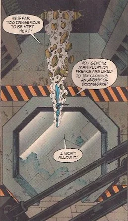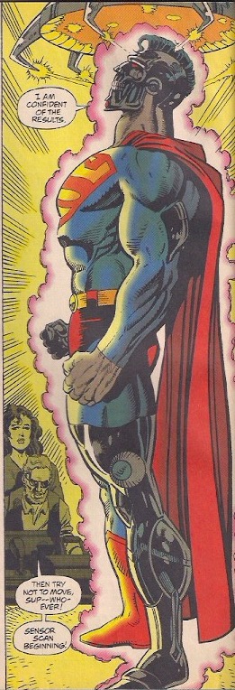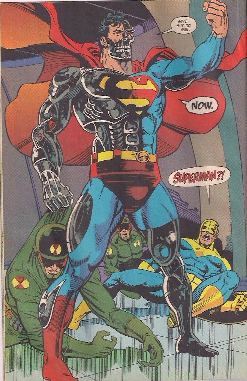 Moments later, Cadmus is under siege. Their defenses are shredded immediately. Finally a new Superman, a cyborg, appears at the door and demands that Guardian take him to Doomsday.