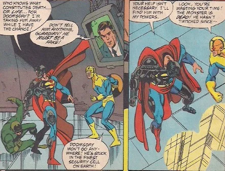 Guardian doubts the Superman’s claims, and refuses to give him information other than that Doomsday has not moved since the battle.