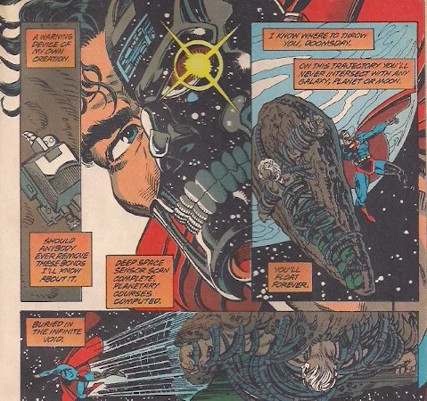 Despite the protests of Cadmus’ head, he takes the body, flying off into space. He straps the body to an asteroid and tosses it away from Earth.